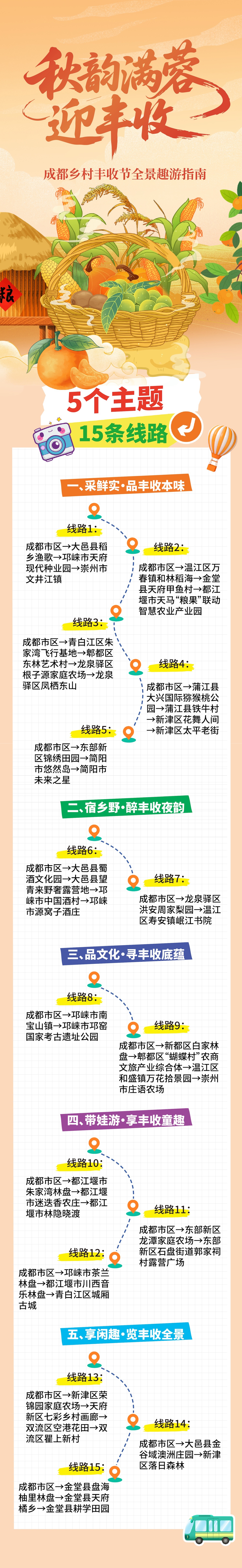 成都市农业农村局相关负责人表示,这15条特色趣游线路将共同描述绘成都乡村 “欢庆丰收、赋能振兴” 的生动图景,诠释 “公园城市” 乡村表达的独特魅力。