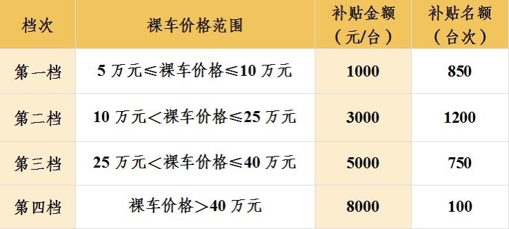 本次活动补贴预算900万元,含1000元、3000元、5000元、8000元4个补贴档次,每个档次补贴名额有限,以消费者提交申请材料时间为准,先到先得,发完即止。