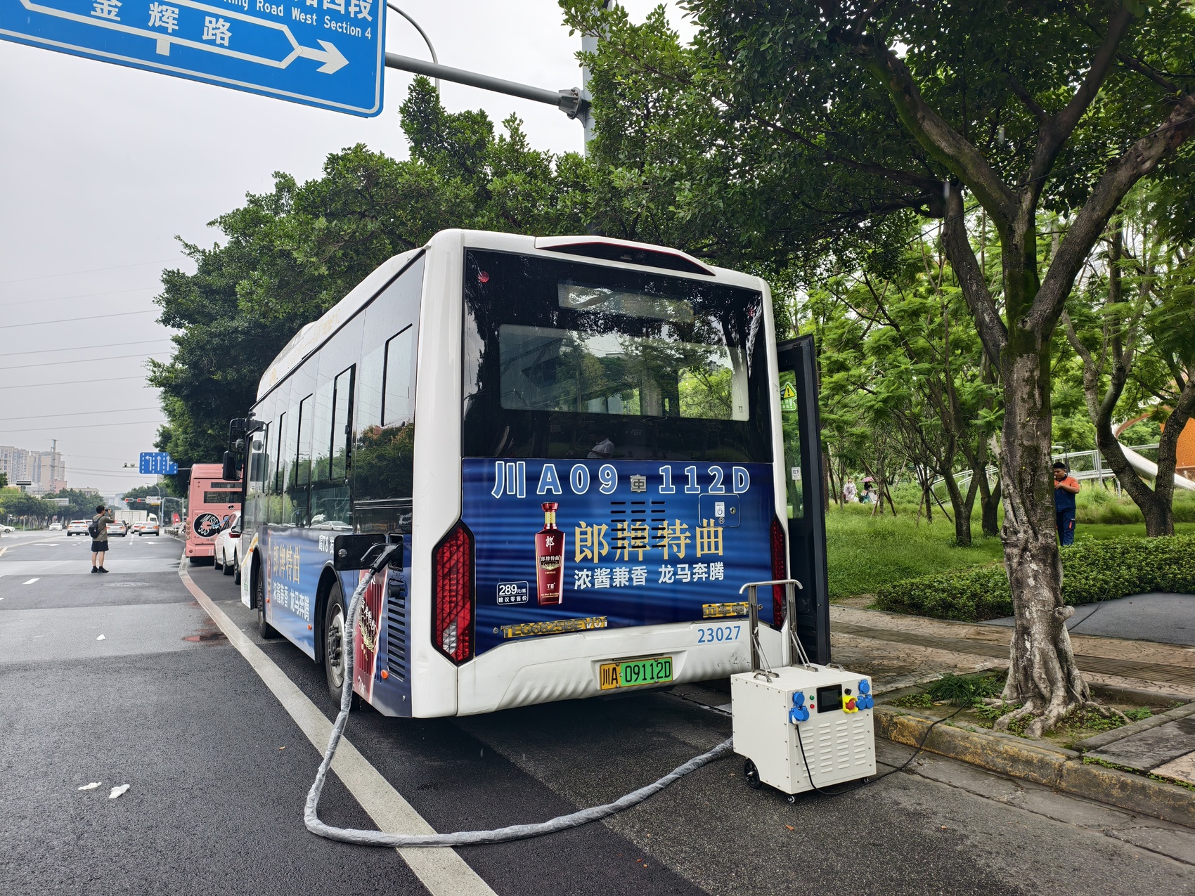 值得一提的是,当天,记者在草坪旁看到,公交车旁放置了一个行李箱状的供电设备。成都公交资产经营管理有限公司工作人员张靖介绍,该电源设备为中车集团与成都公交公司联合开发的移动放电设备,可将公交车的直流电源转化成交流电源对外输出,应用于各种户外活动、应急救灾等场景。 “目前使用的设备为36kW。设备升级后,未来有望应用于居民、工业用电等更多使用场景。”