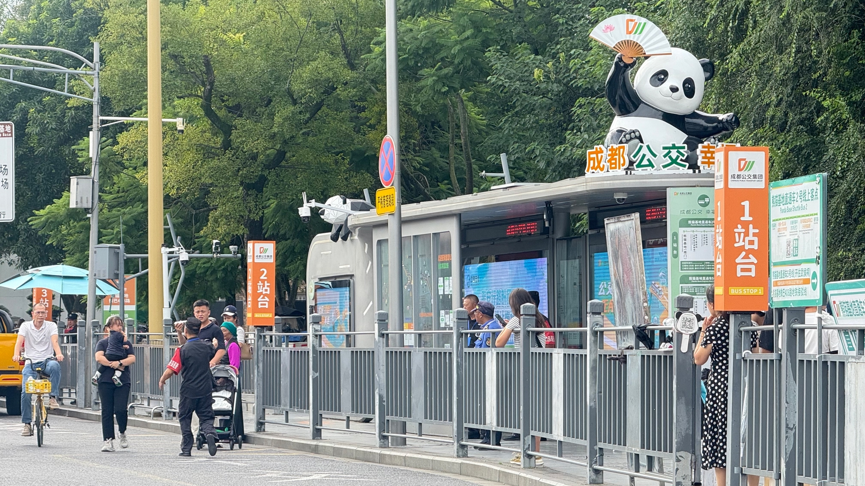 国庆节前期,成都公交将天府机场公交专线3号线延伸至熊猫基地西门,并联合“成都好礼”打造萌趣客服中心,配置高端软质候车座椅、恒温空调系统,提供行李寄存柜、共享充电宝、免费提供饮用水,还设有主题文创专区,随手就能带走成都记忆。