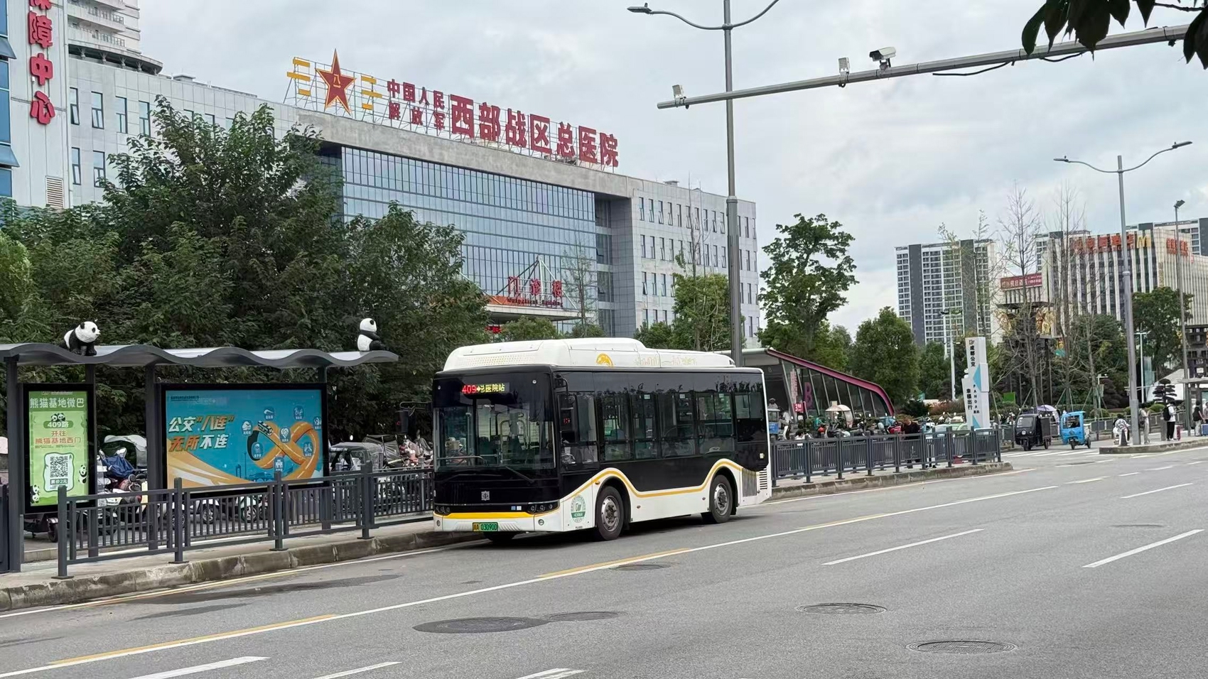 走出地铁军区总医院站B口,记者一眼就看到熊猫基地微巴1号线(409路)站台。成都公交集团北星公司副总经理黄帅介绍,为方便乘客换乘,他们将409路起始站进行调整,使得乘客出地铁换公交步行距离由250米缩短至10米。同时,为保证乘客舒适度,熊猫基地微巴全面采用“车等人”模式,同时,长达30米的标准化候车亭搭配舒适座椅。
