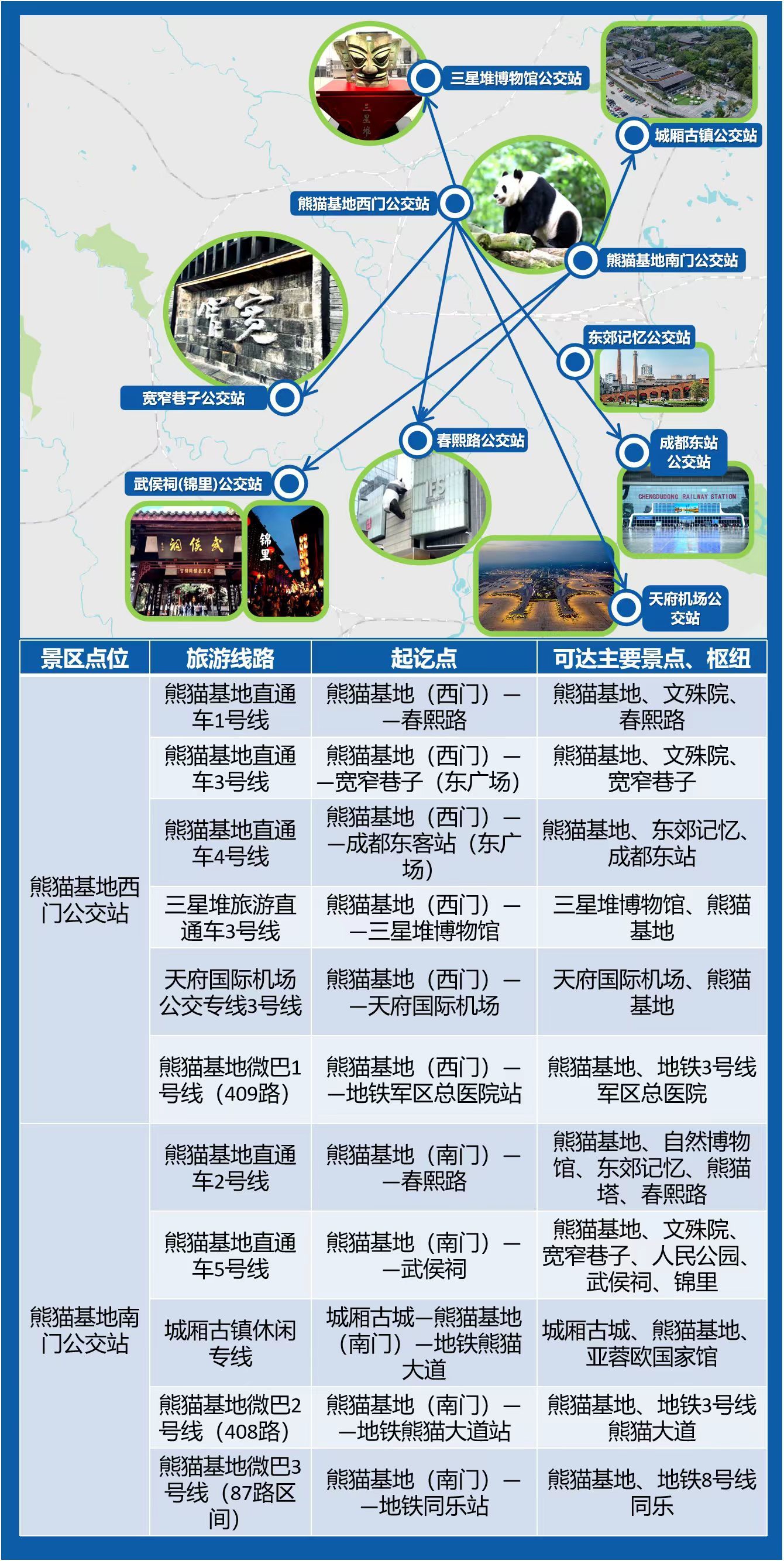 为方便游客快捷往返熊猫基地与三星堆博物馆、春熙路、宽窄巷子、武侯祠、锦里等景区,成都在西门、南门开通6条景区直通车、1条休闲专线。同时,在熊猫基地公交站台新增“线路一览图”——无论游客要前往春熙路、宽窄巷子、三星堆等热门景点,还是需要换乘地铁,行程线路一目了然。