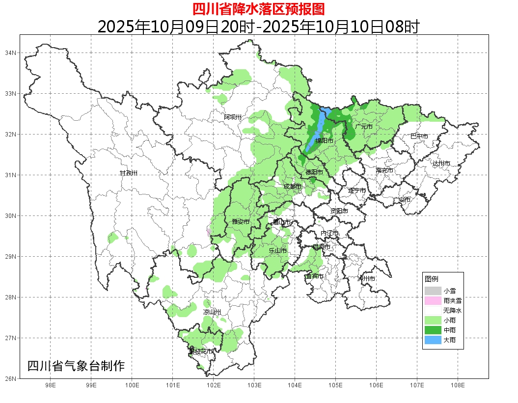 今天晚上:盆地西部阴天间多云有阵雨或雷雨,其中广元、绵阳、德阳3市西部有中雨,局部大雨,盆地其余地方多云;川西高原东部和攀西地区多云间阴有分散阵雨或雷雨,川西高原其余地方多云间晴。