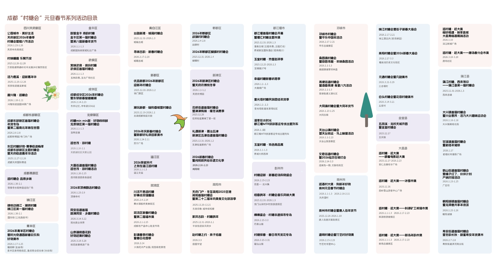 这颗“糖”绝不单调。从新都的嗨购香城,到郫都的村厨大赛,再到青白江的好物展销……元旦春节前后,70余场活动在成都23个区(市)县层层绽放。你可以穿越回宋代温江文庙逛集,也可以在玉林街巷赏味武侯,或是在洛带古镇看汉服巡游。它像是乡村版的“十二月市”,也像是一场场产品博览会、供需对接会、投资推介会。这颗“糖”,花样百出,总有一款对你的味。