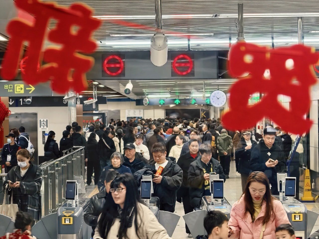 春节期间,成都地铁站人潮涌动。