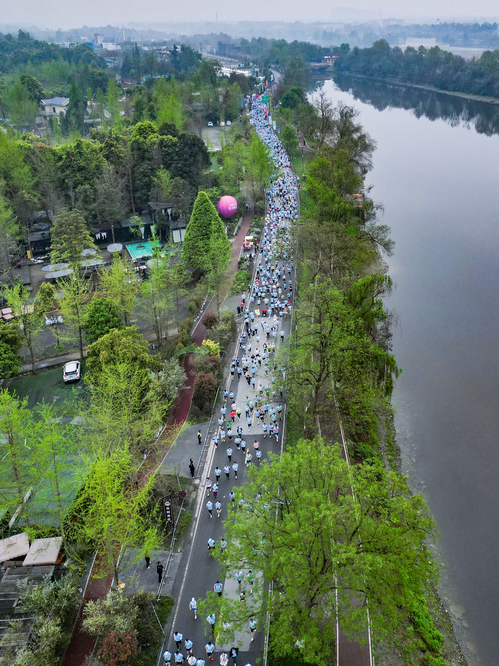3月29日上午,2026圣恩温江“一路繁花”快乐村跑在温江区鲁家滩湿地公园开跑,近3000名跑步爱好者涌入温江区的金马河畔的“繁花赛道”。