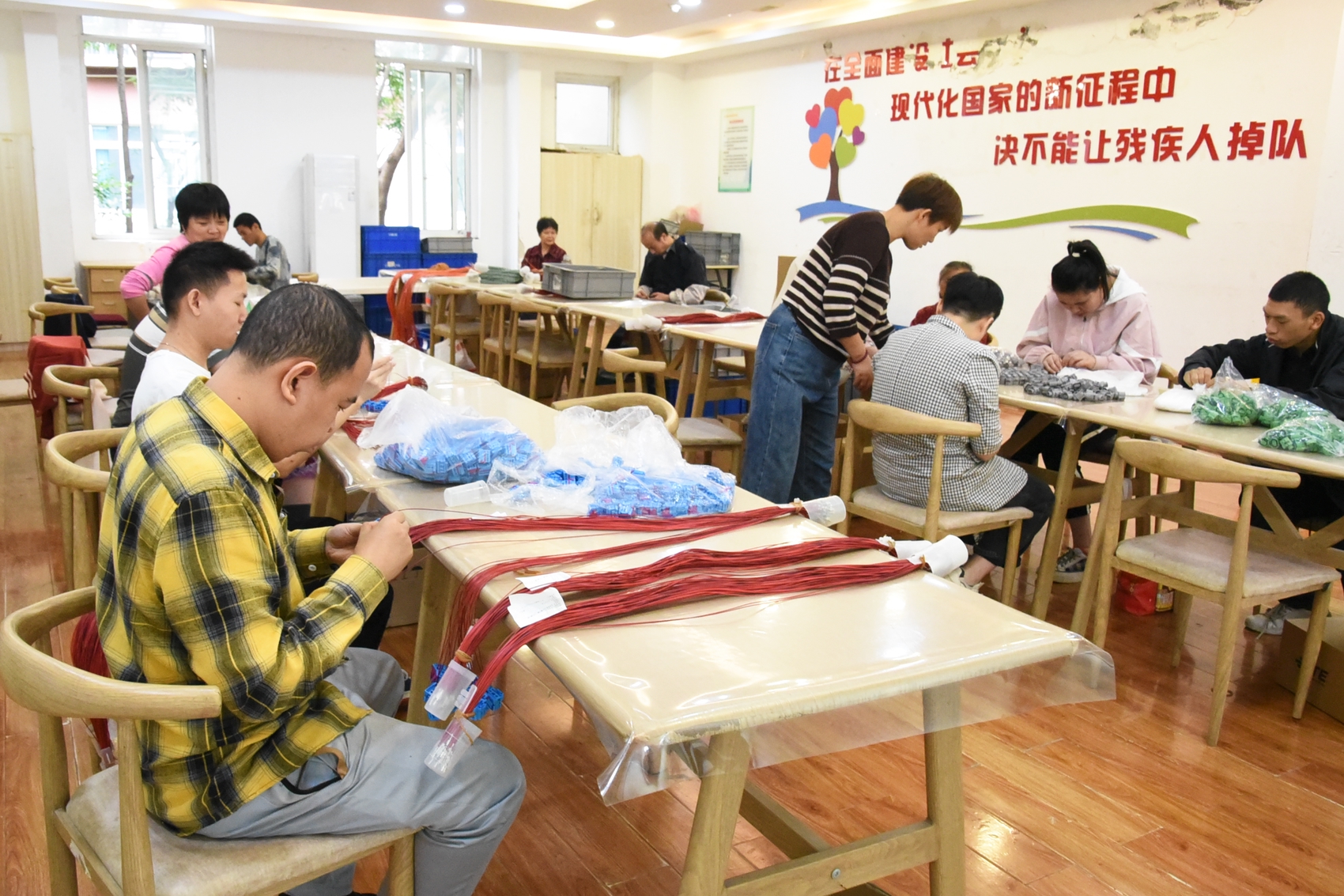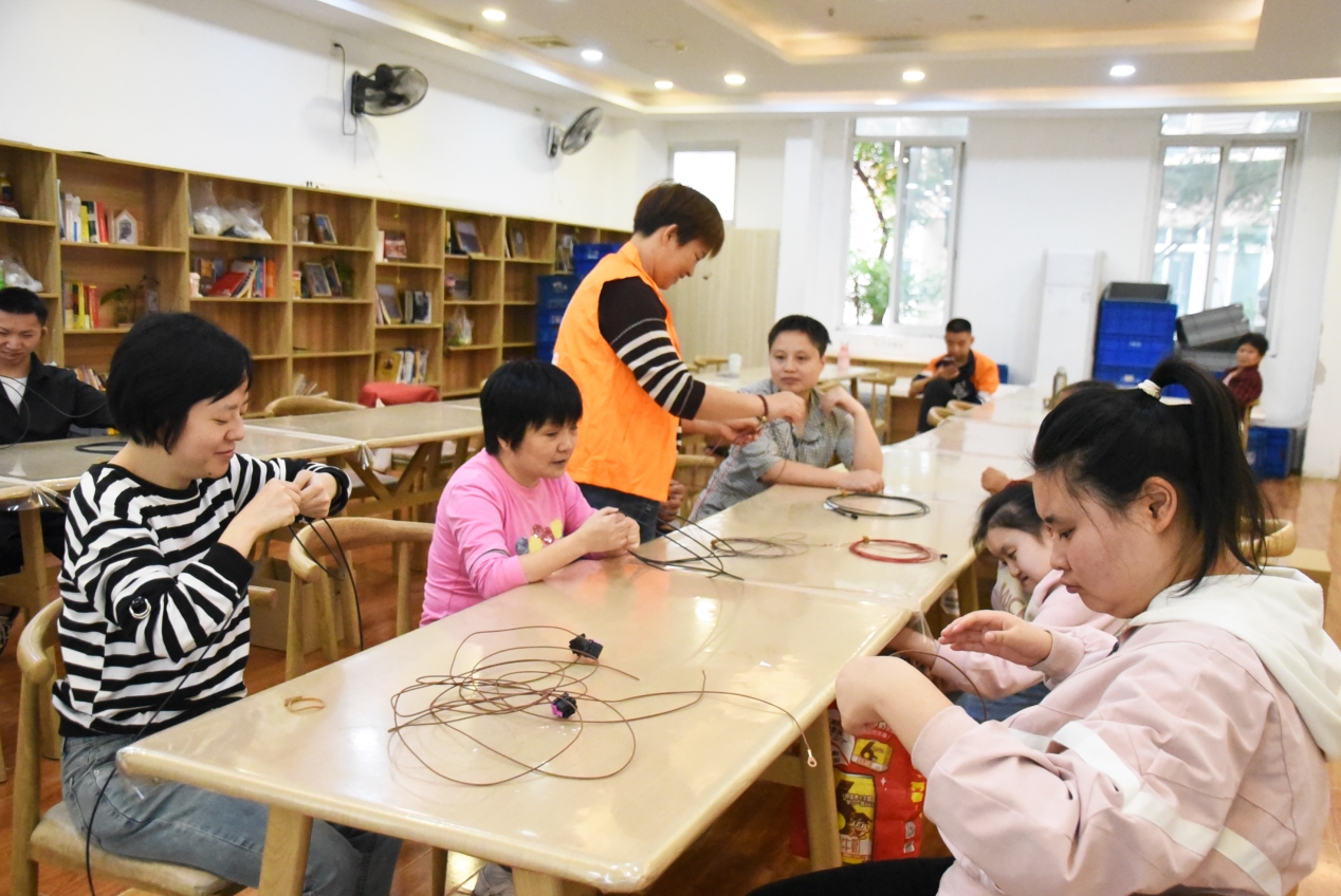 在基地位于西河街道胜利家园的辅助性就业技能训练室,这样的互助场景随处可见。依托当地优势汽车产业,基地引入适合残疾人参与的汽配加工辅助性就业项目,残疾人朋友在老师指导和同伴互助下,熟练掌握了汽车线束加工技能。50多岁的李大爷有重度残疾,如今他不仅能胜任日常“工作”,还主动承担后勤、卫生等辅助任务,帮“新人”快速融入;25岁的智力残疾人蓉蓉,和同样有智力障碍的姑姑一起学技能、交朋友,渐渐打开了心扉。