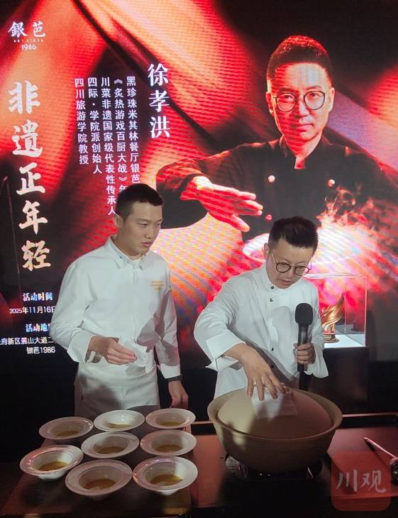 “非遗正年轻”。11月16日晚,川菜国家级非遗代表性传承人徐孝洪以此为主题,在他主理的餐厅接待50余位美食博主共享“冠军宴”,把刚刚在《百厨大战》中取得胜局的菜肴进行复现。