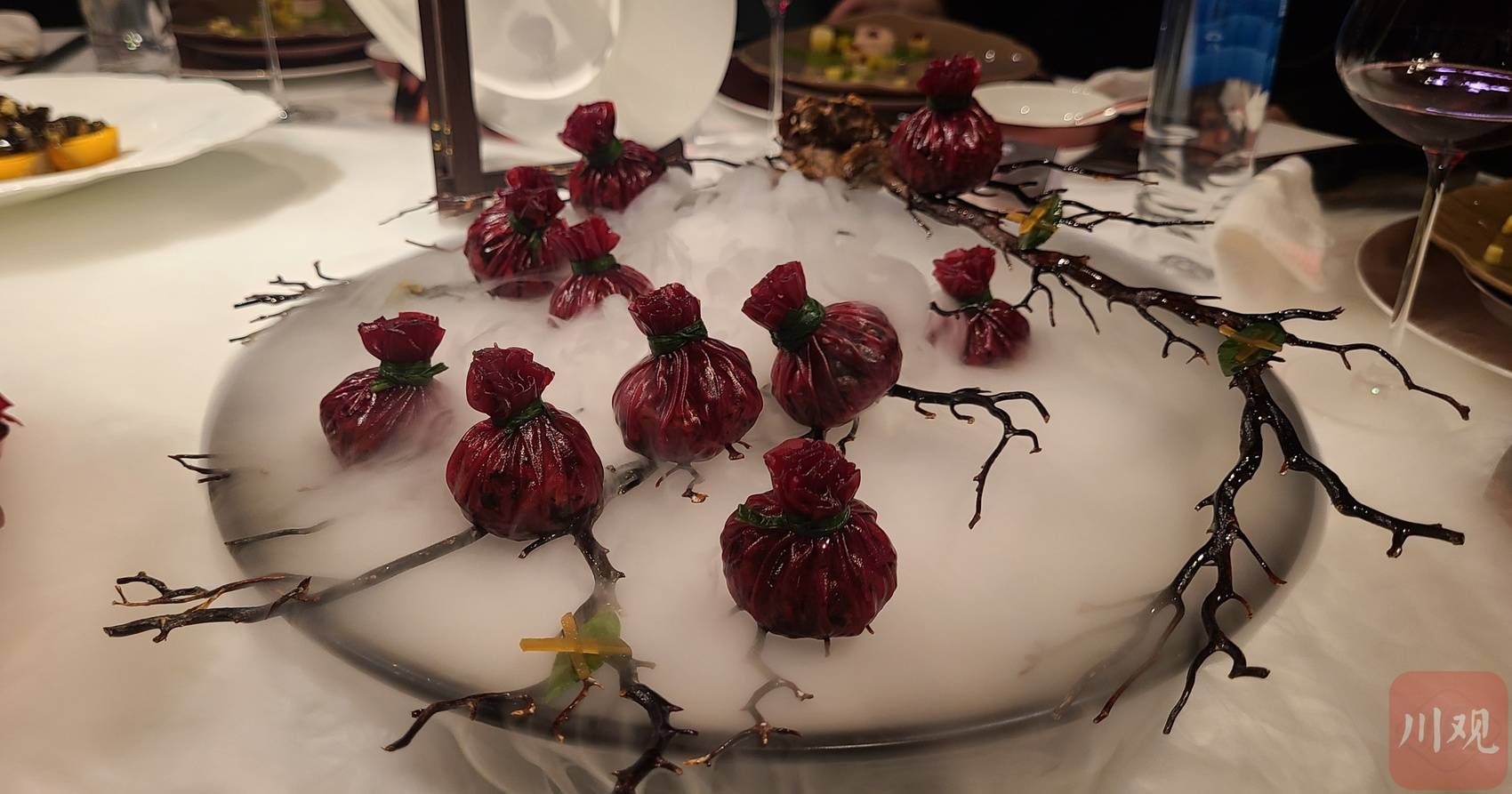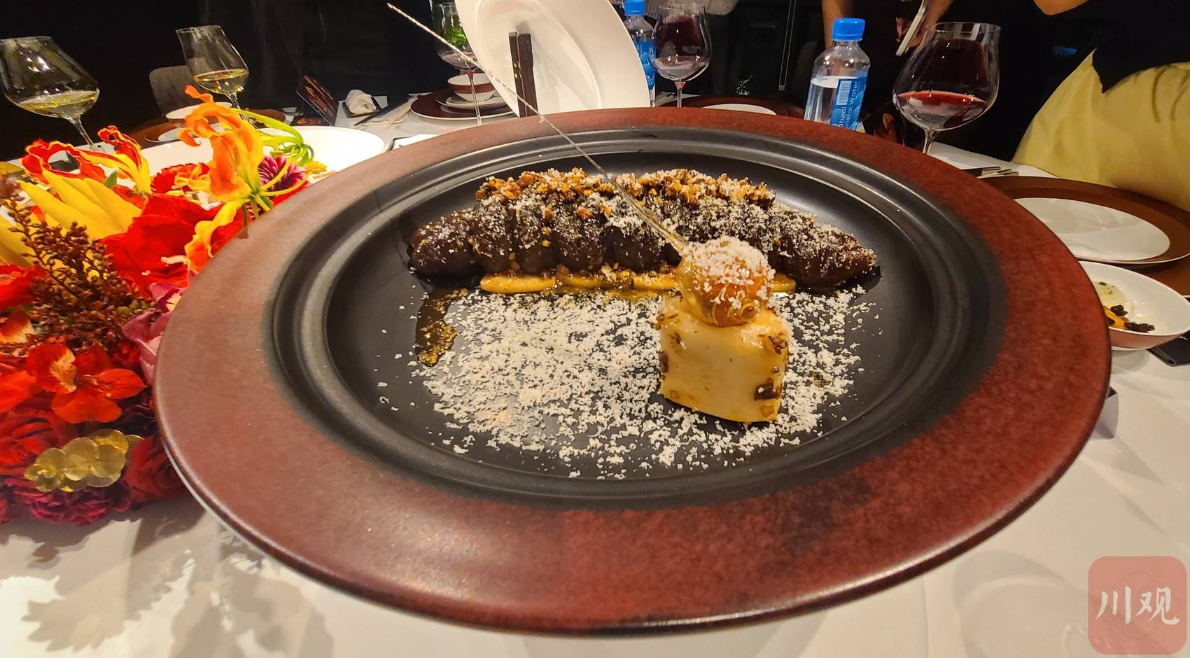 晚宴现场,大屏上播放参赛场景。决胜局中的“寒江钓雪”令大家赞叹。“当时只有60分钟比赛时间,要求以年糕为主材,成菜有‘中式意境’……”这是川菜较少用到的食材,徐孝洪用了15分钟构思,然后一气呵成,完成了“寒江钓雪”创意菜——“年糕是米制品,我想到了同样是米制品的叶儿粑,”徐孝洪将年糕和叶儿粑肉馅进行融合炒出臊子,随后用草莓裹糖拉丝塑造出“鱼竿”,用年糕堆成船型,再将炒好的臊子放在“船”上,每一步都藏着巧思。“主题‘麻’,我是用油脂性的肉去做麻,它的香气就更加足。”现场,徐孝洪团队加入了干烧海参,作为给博主、粉丝的“福利”。