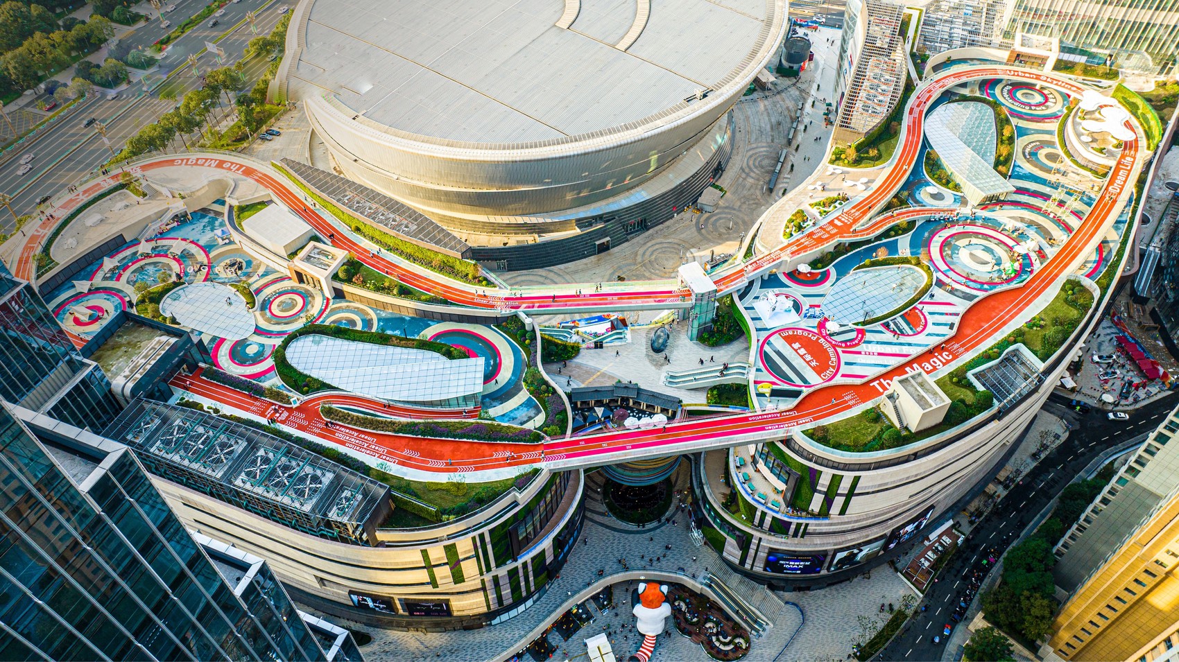 成都大魔方招商花园城,商场楼顶到地面高度36.5米。拥有“西南首个天际跑道”和“成都首个亚马逊空中雨林乐园”,打造从屋顶运动休闲到室内消费的闭环。