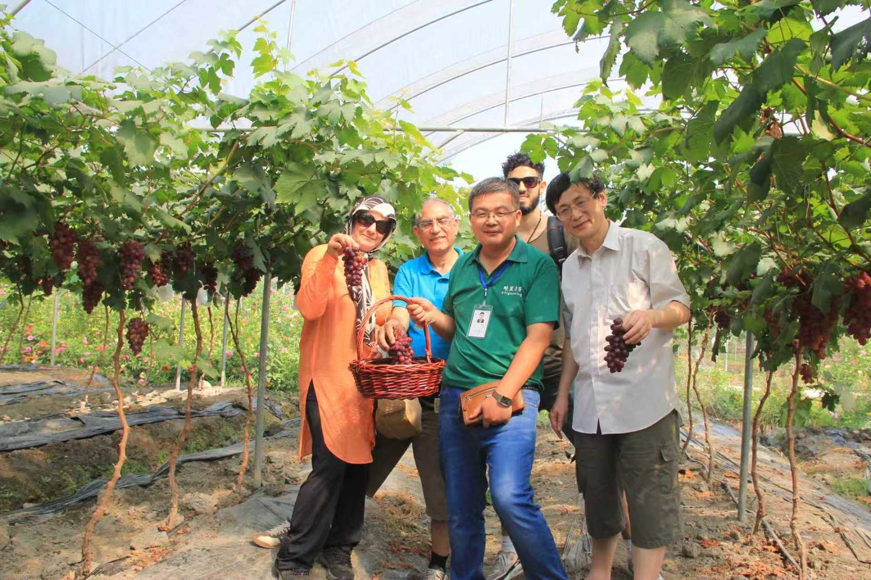 国外游客体验葡萄采摘。
