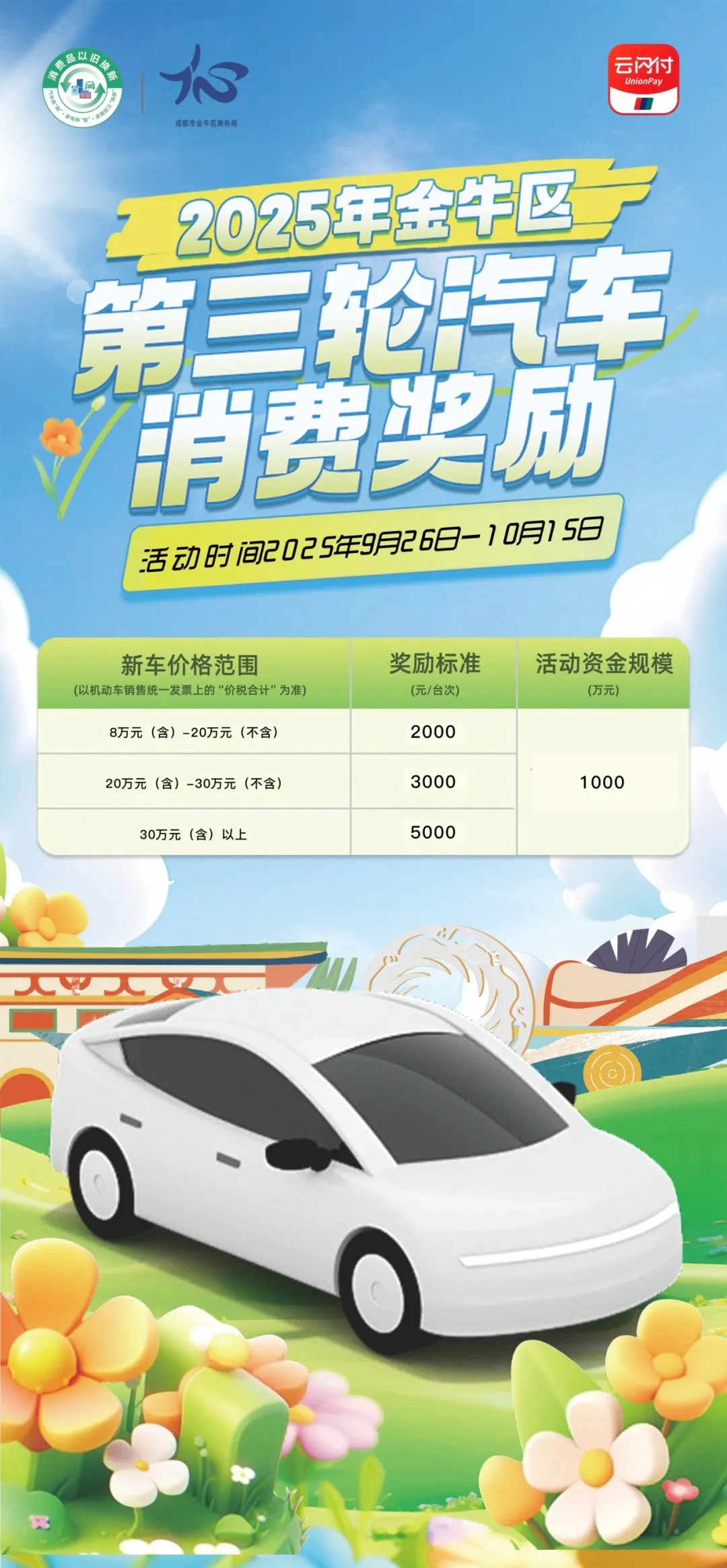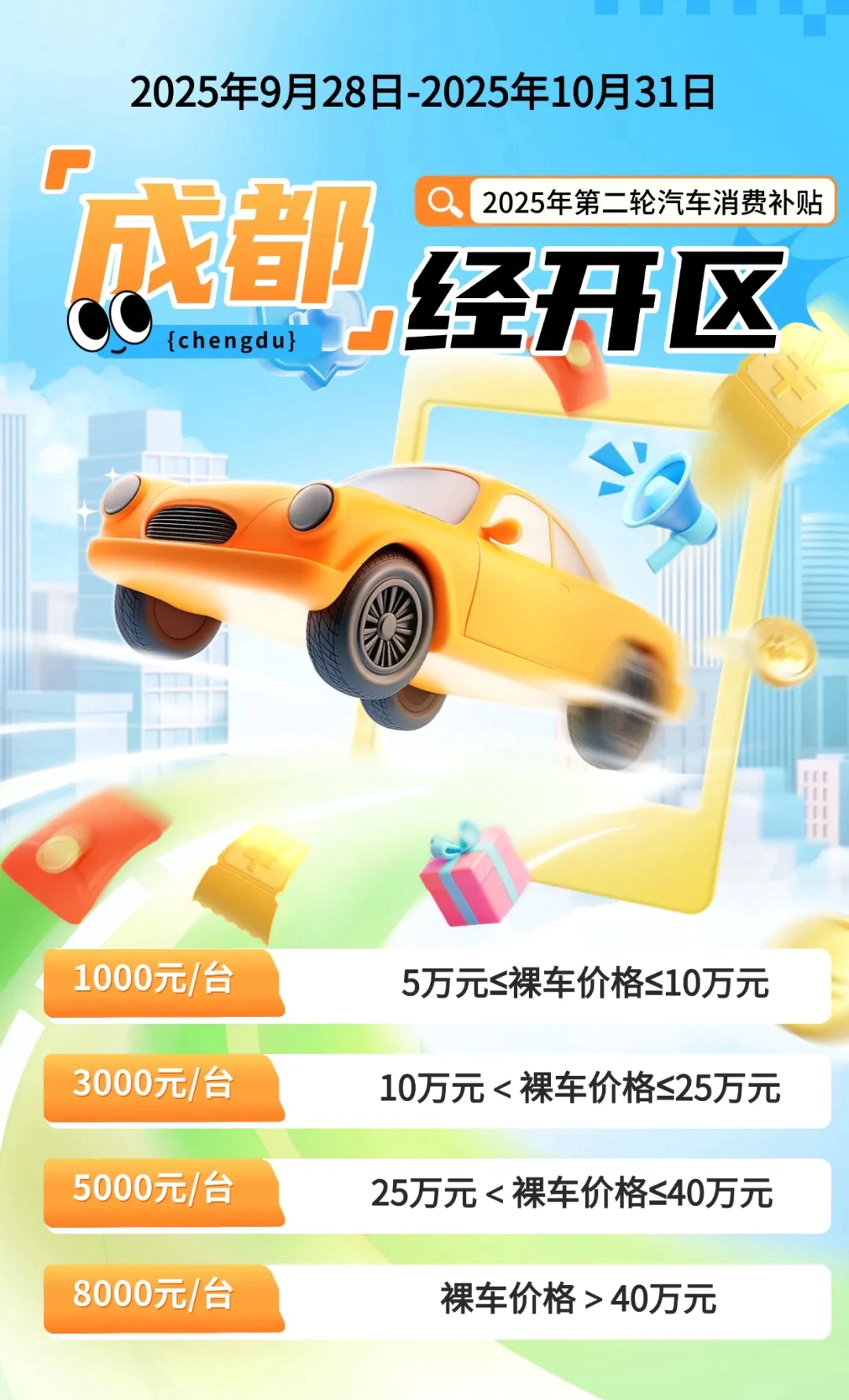 成都经开区(龙泉驿区)于2025年9月28日-2025年10月31日开展今年第二轮汽车消费补贴活动,采用“消费者先购买,政府后补贴”形式进行。活动向在参与活动的成都经开区(龙泉驿区)汽车零售企业购置家用乘用新车,且按要求提交资料并通过审核的个人消费者,发放购车云闪付红包补贴,最高每台车可补贴8000元。