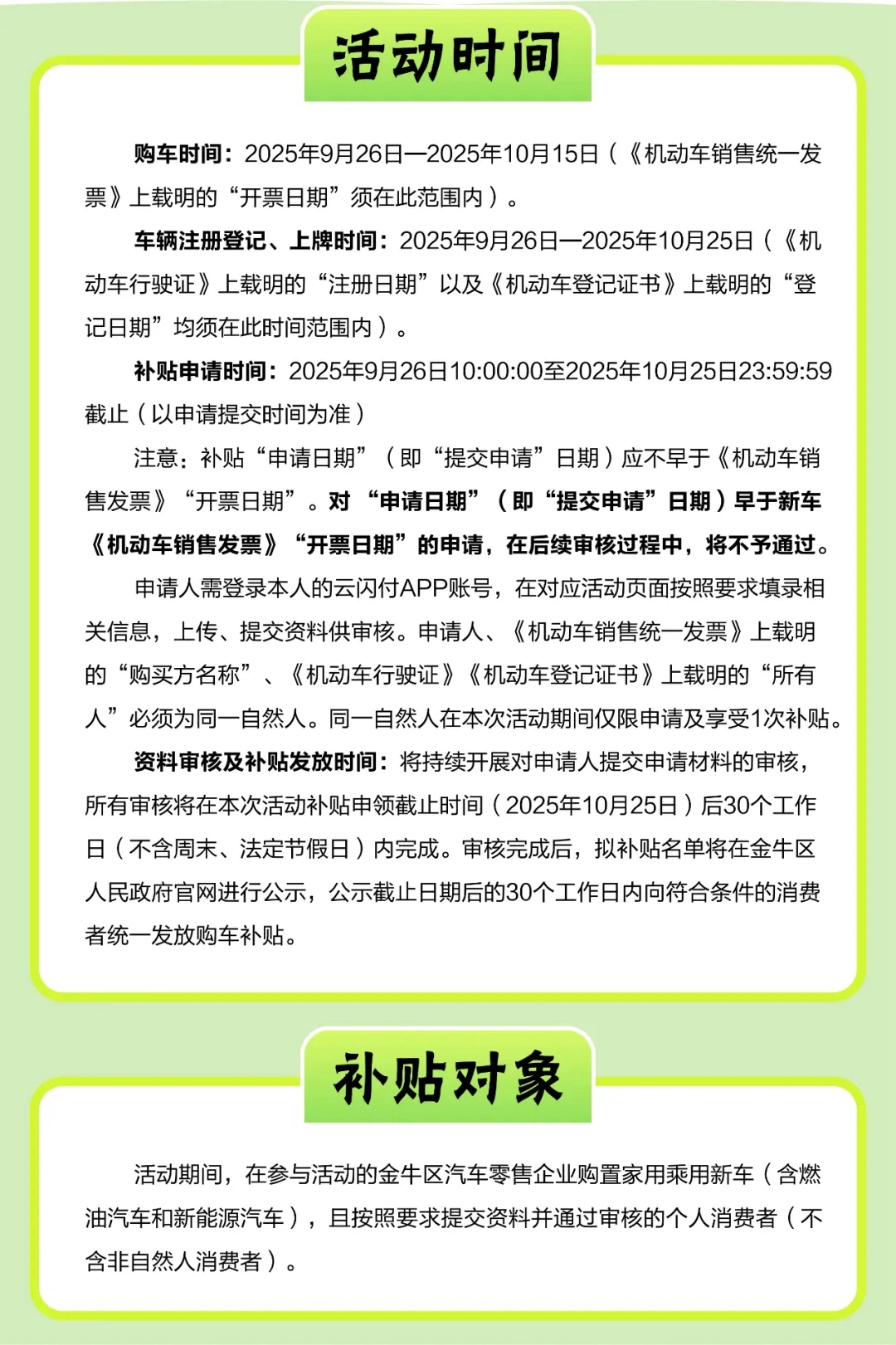 购车时间:2025年9月28日-2025年10月31日(《机动车销售统一发票》上载明的“开票日期”须在此范围内)。