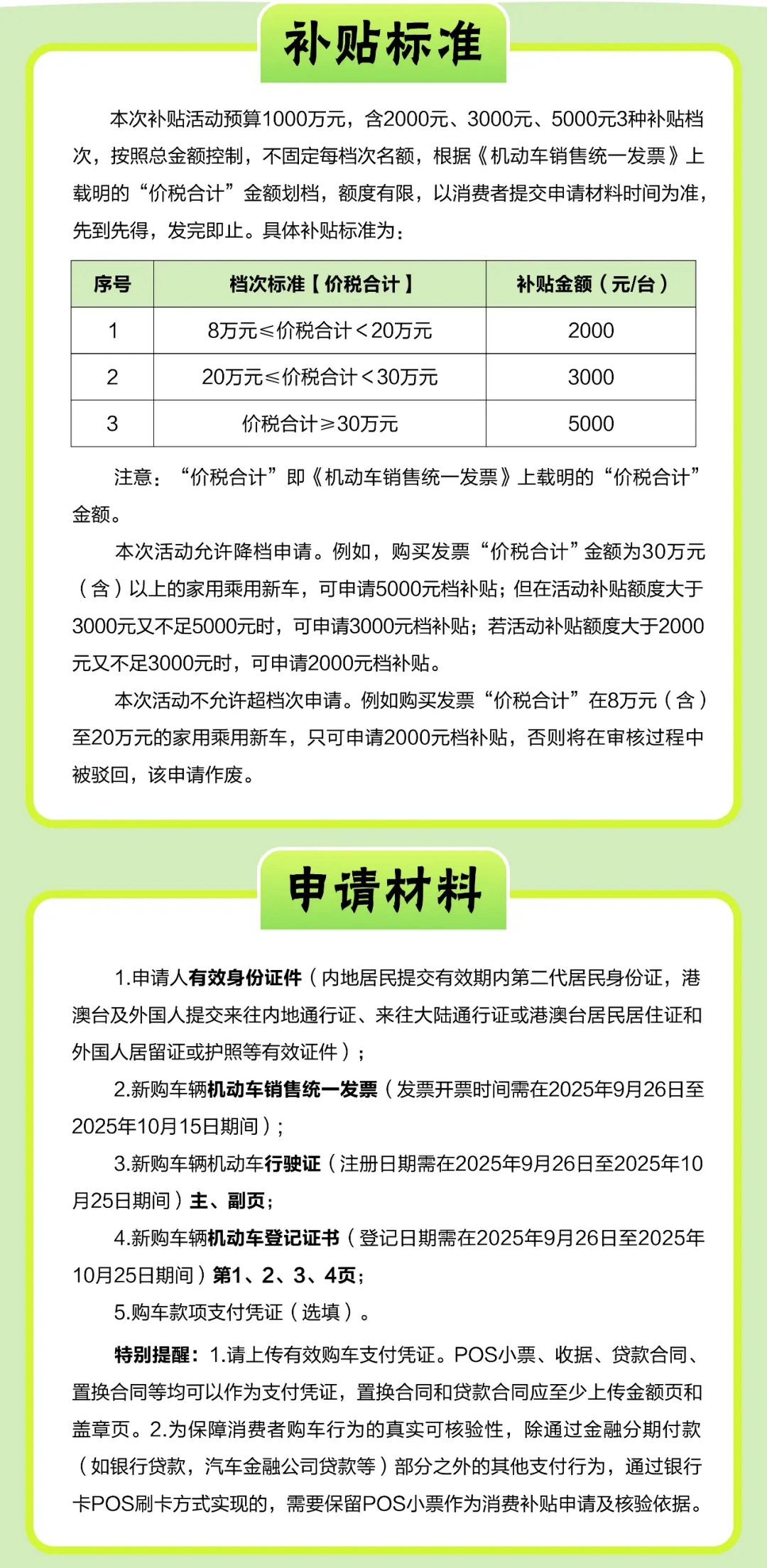 2025年10月10日-10月24日,个人消费者在参加活动的汽车销售企业购买新车,取得购车发票,并办理新车上牌手续、取得车辆登记证。