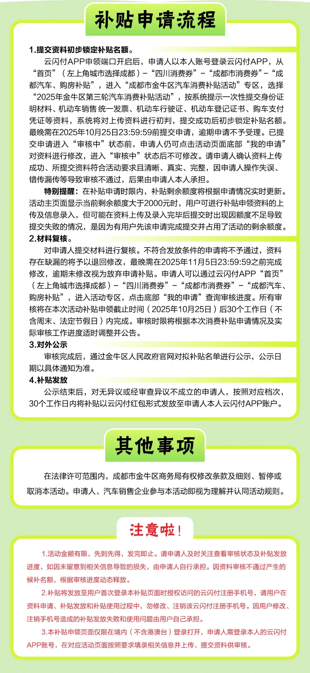 资料审核及补贴发放时间:预计在补贴申领截止时间(2025年11月15日)后20个工作日(不含周末、法定节假日)内完成对申请人提交申请材料的审核。审核完成后,拟补贴名单将在成都经开区(龙泉驿区)商务局官网进行公示,公示截止日期后的10个工作日内向符合条件的消费者统一发放购车补贴。
