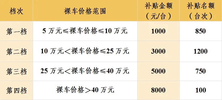 本次活动补贴预算900万元,含1000元、3000元、5000元、8000元4个补贴档次,每个档次补贴名额有限,以消费者提交申请材料时间为准,先到先得,发完即止。具体补贴标准为: