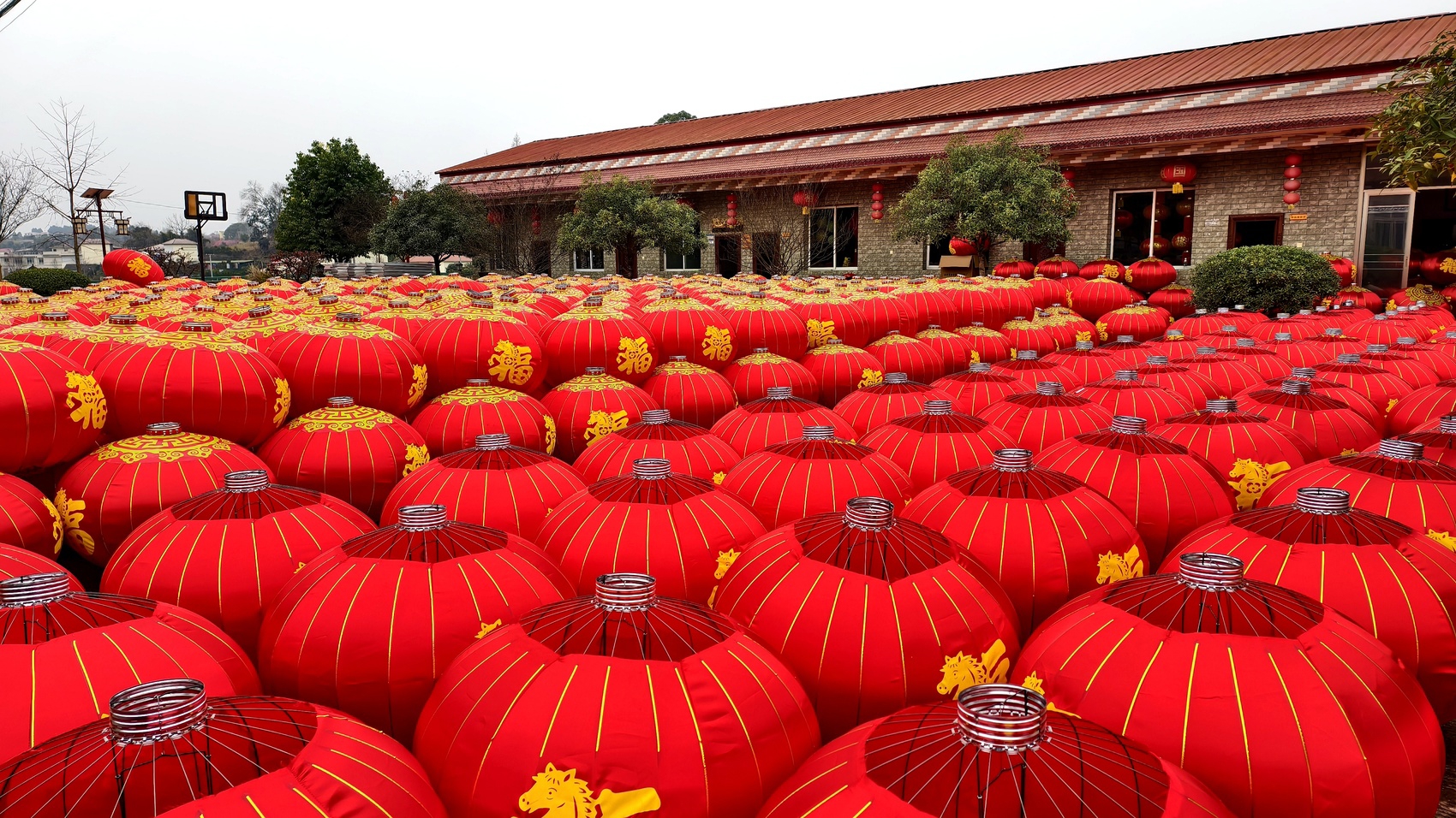 腊月里,成都市金堂县金龙镇处处洋溢着喜庆暖意。鸿发灯笼厂内,红灯笼层层叠叠铺了满地,绸布面上,烫金福字与奔马图案跃然其上。工人们巧手翻飞,把竹骨与红绸细细缀合。