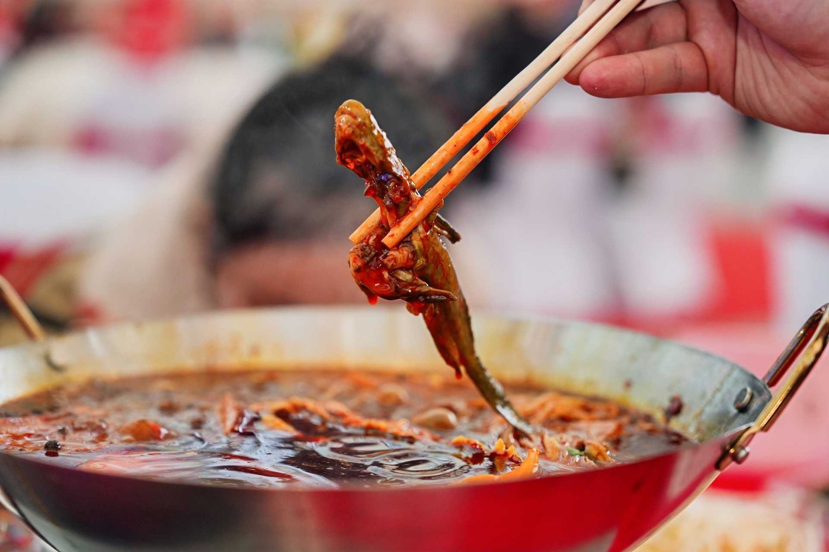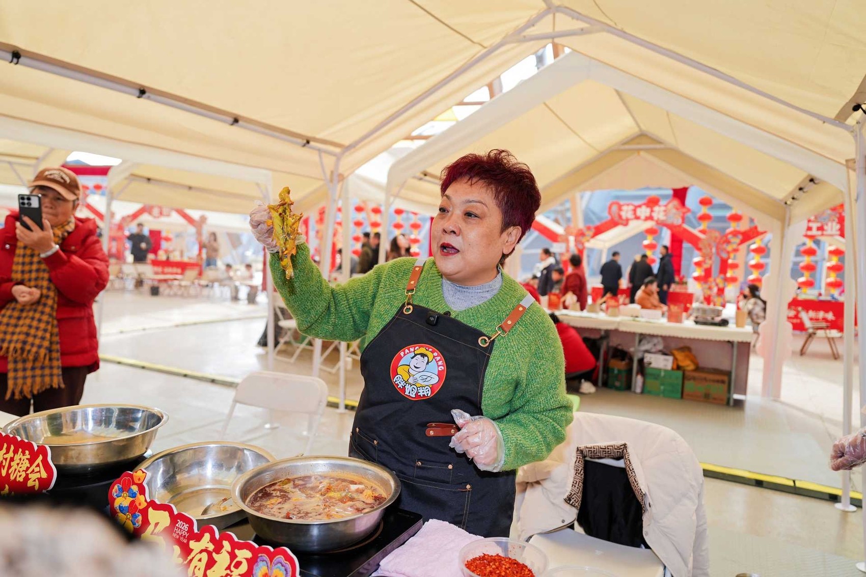 胖大姐黄辣丁展位前,油锅正沸。张利平——认识她的人都叫她“胖大姐”,弯腰将黄辣丁滑入锅中,“滋啦”一声,麻辣鲜香腾起白雾。里三层外三层的市民游客,踮脚举着手机,往灶台边挤。她直起腰,将刚出锅的鱼分进小碟,嗓门透亮:“水煮麻辣,最招牌的味道。来,尝尝!”